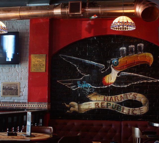 Паб в чем-то схож с рюмочной, которые пользовались успехом в советские времена. Сейчас их почти не осталось. Внутри возникает это неловкое чувство телепортации с одной из старых европейских улочек - медные вытяжки и барная стойка, керамическая плитка и витражные светильники. Впрочем, от Ирландии в Harat’s не только интерьер и живые напитки, но и барные традиции: во-первых, здесь по-домашнему нет официантов, что естественным образом сближает посетителей с барменом, во-вторых это все-таки питейное заведение, где главное находиться в бокалах и шотах, а не в тарелках. Однако и традиционная ирландская похлебка, и мясо с салатами, и даже десерты в меню, здесь все-таки есть. Но это скорее для более долгого «продолжения банкета». Кстати, здесь обещают еженедельно живые концерты ростовских групп. Так что есть смысл следить за афишей.